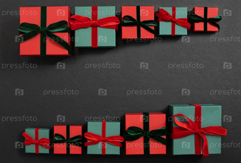 Красные и зеленые подарки на черном фоне. Рамка рождественских подарков. Праздничные украшения. Новый год. Открытка. Скопируйте пространство, вид сверху, плоская планировка