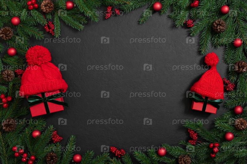 Рождественская граница с красными подарками в шляпах и праздничными украшениями на черном фоне. С Новым Годом. Открытка. Скопируйте пространство, вид сверху, плоская планировка