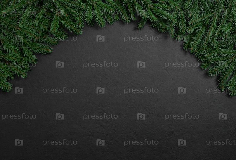 Рождественская арка с еловыми ветками на черном фоне. Рождественская граница. Праздничная открытка с местом для текста. Вид сверху, плоская планировка