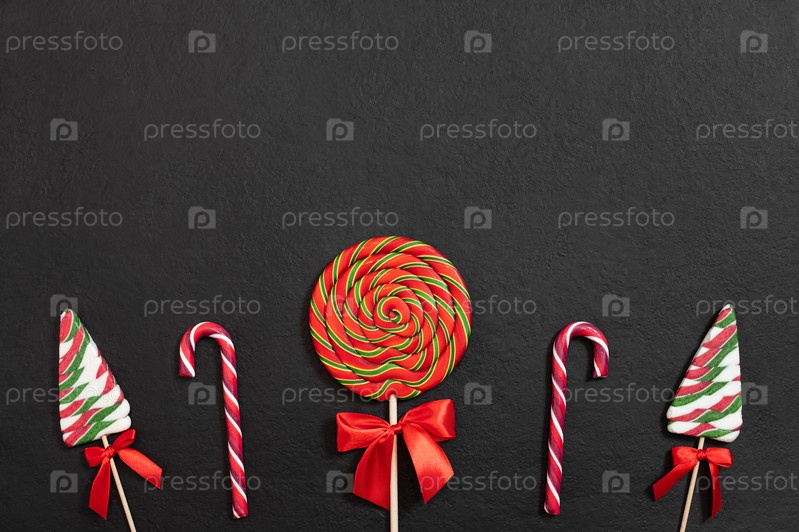 Рождественская граница с праздничными леденцами на черном фоне. Рождественская конфета. С Новым Годом. Открытка. Скопируйте пространство, шаблон. Вид сверху, плоская планировка