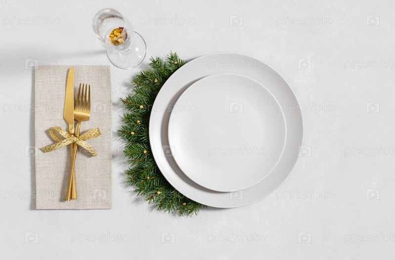 Сервировка рождественского стола с пустой тарелкой, золотыми столовыми приборами и стаканом на сером фоне. С Новым Годом. Место для текста. Зимняя концепция. Вид сверху, плоская планировка