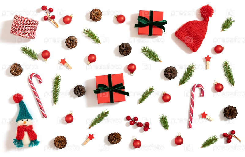 Рождественская композиция с еловыми ветками, красными украшениями и подарками на белом фоне. Рождественская открытка. С Новым Годом. Вид сверху