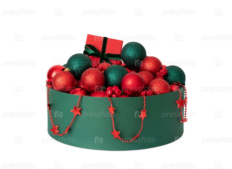 Рождественский декор в коробке, изолированные на белом фоне. Красные и зеленые рождественские украшения. Хранение праздничных принадлежностей