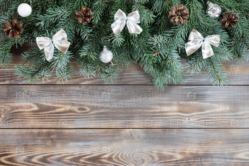 Рождественская граница с еловыми ветками, серебряными шарами и бантами
