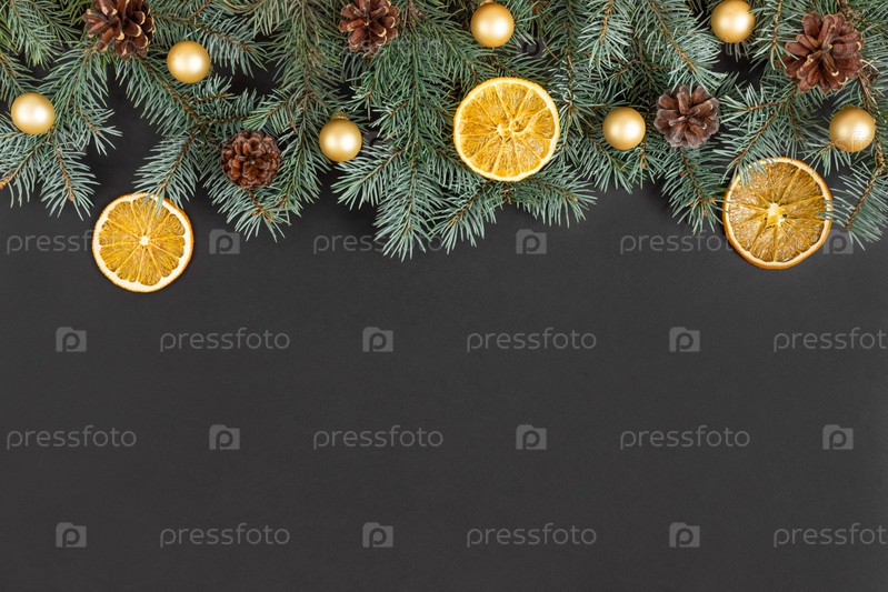 Рождественская граница с еловыми ветками, шишками, золотыми шарами и сушеными дольками апельсина на черном фоне