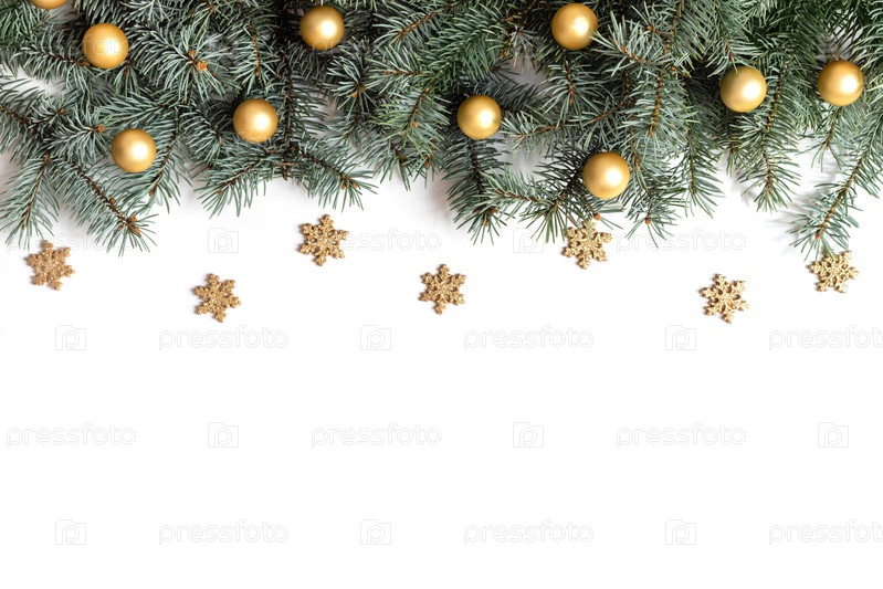Новогодняя рамка с еловыми ветками, золотыми снежинками и шарами на белом фоне