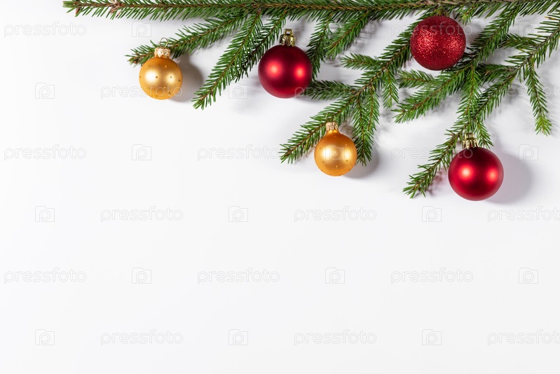 Рождественская граница из еловых веток, золотых и красных шаров на белом фоне. Плоская планировка, вид сверху, пространство для копирования. Рождественский фон
