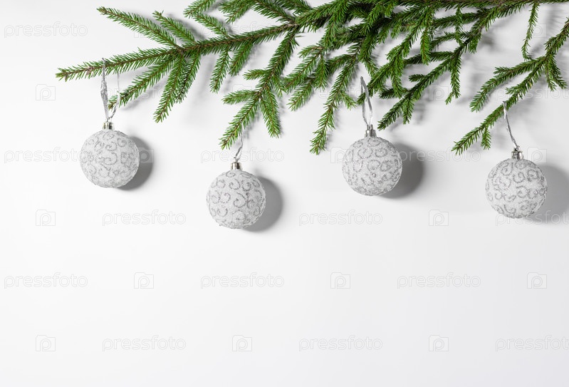 Рождественский бордюр из натуральных еловых ветвей, белый с серебряными шарами на белом фоне. Плоская планировка, вид сверху, пространство для копирования. Рождественский фон