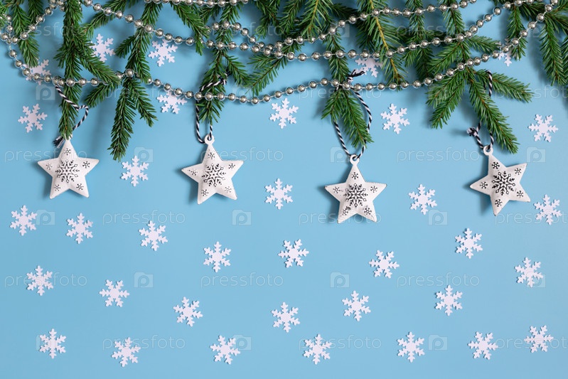 Новогодний фон с белыми снежинками, звездами, еловыми ветками на пастельно-голубом. Открытка. Зимняя концепция. С Новым Годом