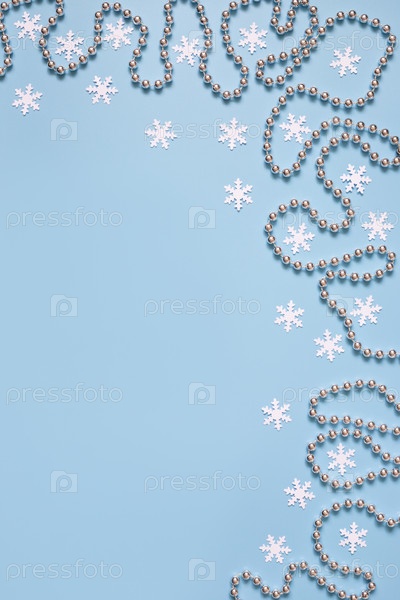 Рождественская граница с серебряной гирляндой и звездами, белыми снежинками на пастельно-голубом фоне. Место для текста. Зимняя концепция