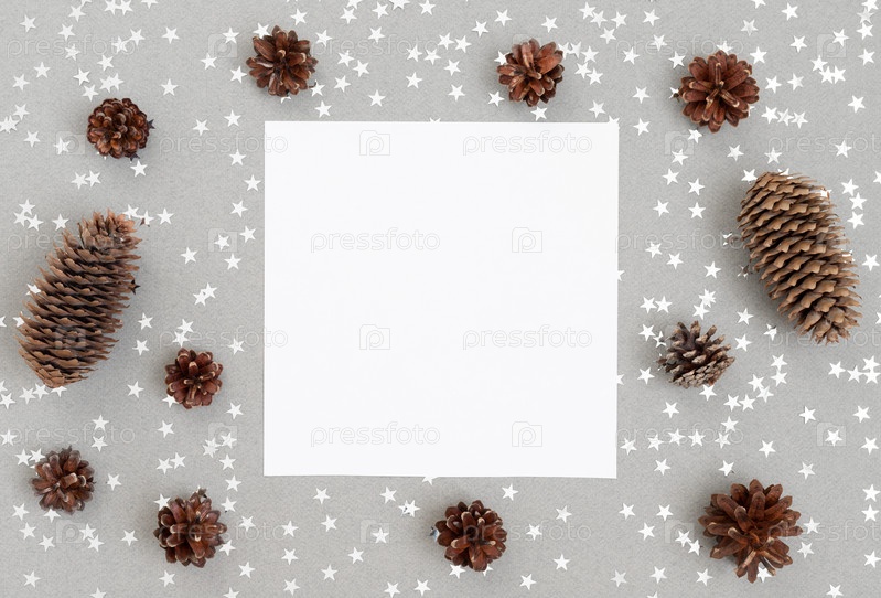 Рождественский макет с серебряными звездами и еловыми шишками на сером фоне. С Новым Годом. Зимняя концепция. Место для текста