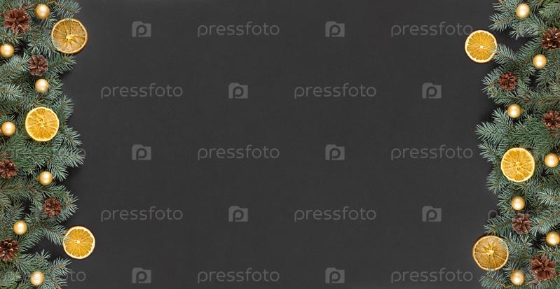 Рождественский баннер с еловыми ветками, шишками, золотыми шарами и сушеными дольками апельсина на черном фоне