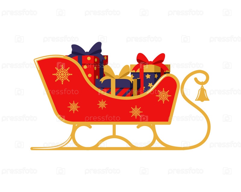 Рождественские сани с подарочными коробками. Цветная векторная иллюстрация в плоском стиле. Белый изолированный фон