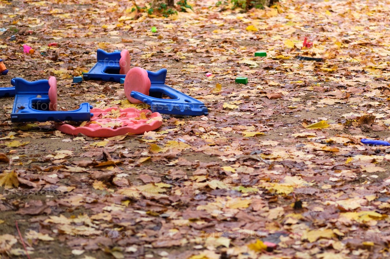 Разрушенная старая детская площадка осенью. Опавшая желтая листва. Выборочный фокус