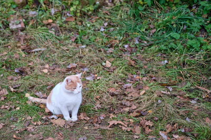 Милый белый кот с коричневыми пятнами сидит на осенней траве