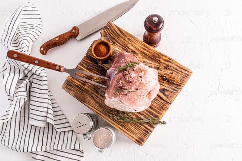 Свежее мясо свинины на ферме лежит на деревянной текстурированной доске рядом с контейнерами для специй для приготовления пищи. белый фон. вид сверху