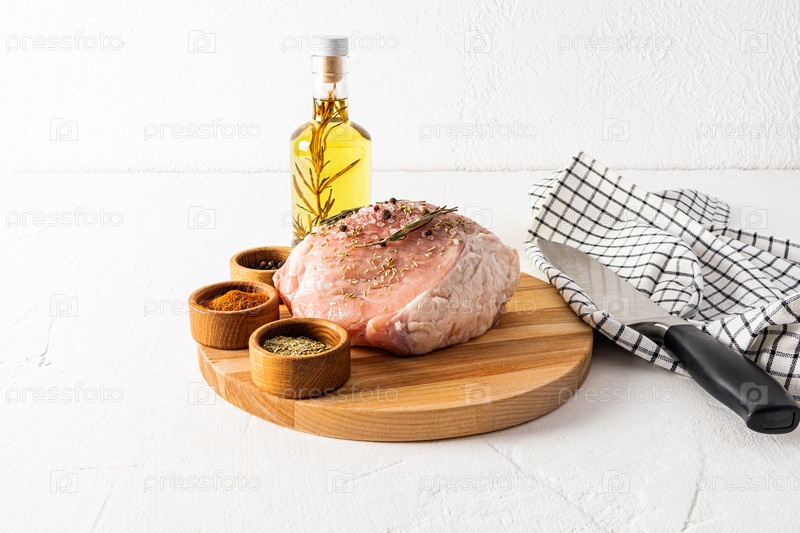 Сырая свинина на круглой разделочной доске с мисками с различными специями и розмариновым маслом для приготовления пищи. концепция приготовления мяса