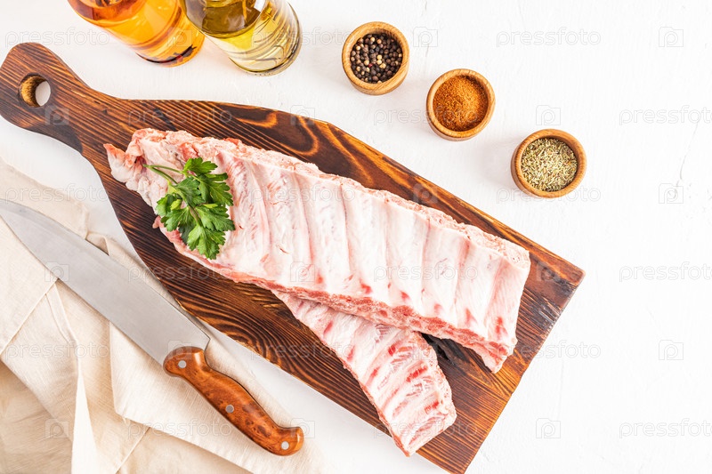 Вид сверху на свежие свиные ребрышки, лежащие на деревянной длинной разделочной доске со специями в мисках на белом фоне