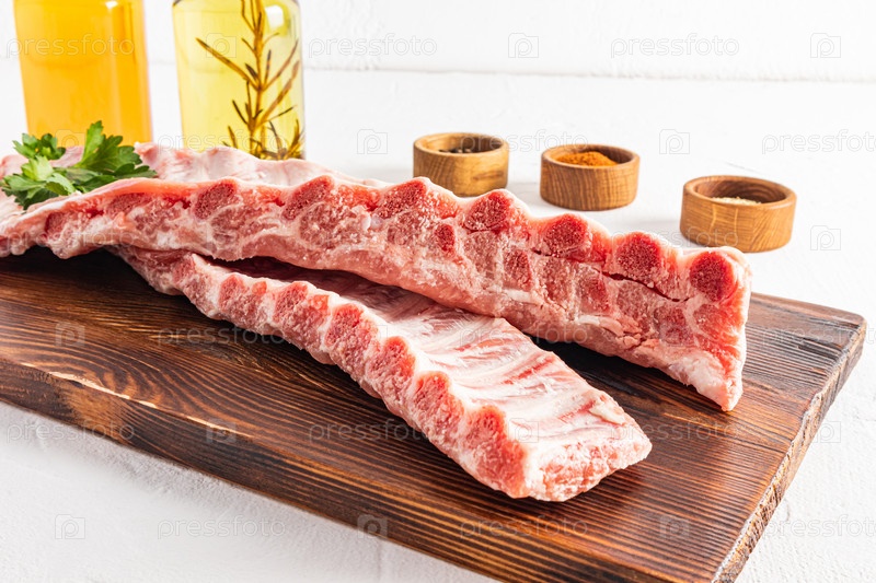 Вид спереди сочных сырых свиных ребрышек на разделочной доске. белый фон. специи для жарки ребрышек