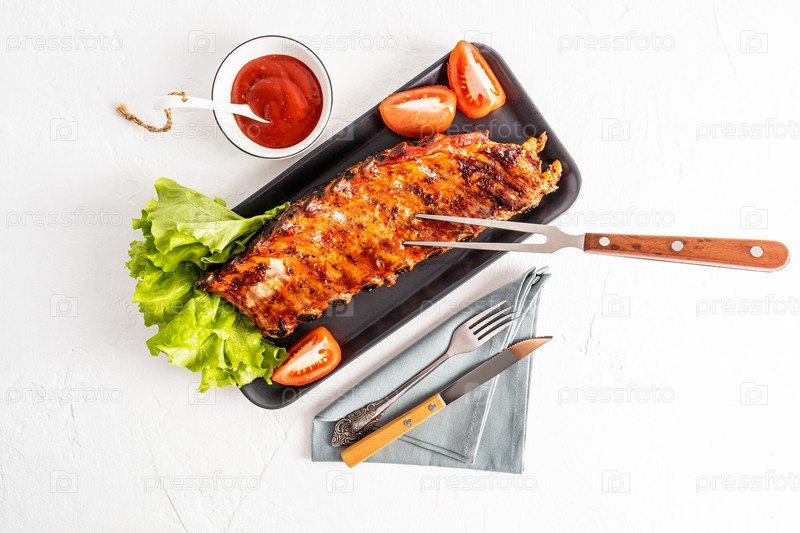 Жареные свиные ребрышки на керамической прямоугольной тарелке с ломтиками свежих помидоров и листьями салата. соус для улучшения вкуса. вид сверху. белый фон