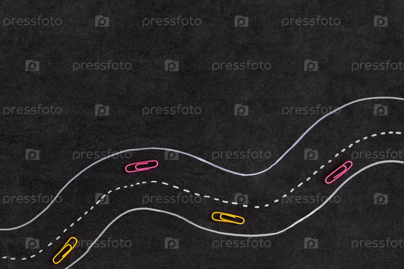 Дорога нарисована на доске мелом, скрепки изображают автомобили