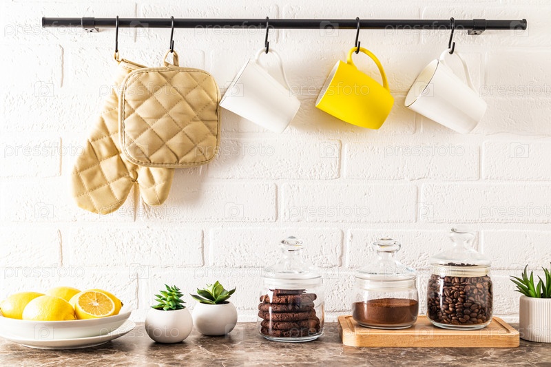 Вид спереди на кухонную столешницу со стеклянными банками с кофе и комнатными растениями в горшках. белая кирпичная стена с перилами и кружками