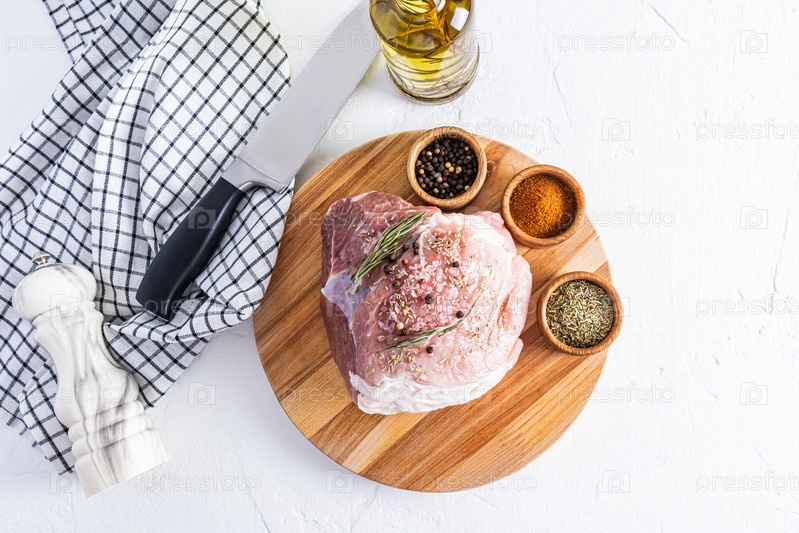 Свиная ветчина на пару на круглой доске с ингредиентами для приготовления пищи. нож, полотенце. вид сверху. белый текстурированный фон