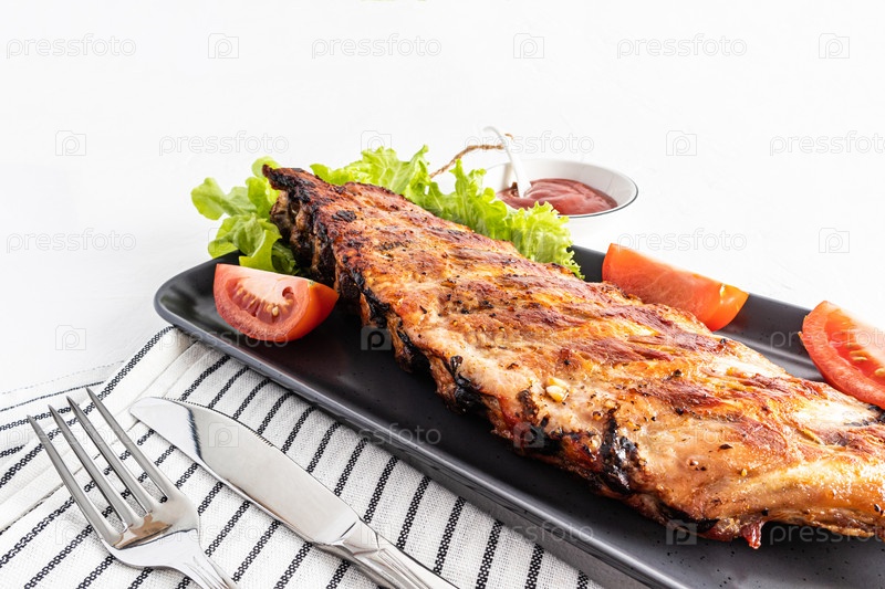 Вкусные поджаренные свиные ребрышки на плоской керамической тарелке со свежими овощами. белый фон. копия пространства. меню рецептов