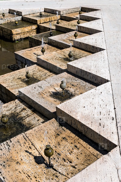 Армения, Ереван, сентябрь 2022 г. Бронзовые фонтаны на каменных плитах Каскада