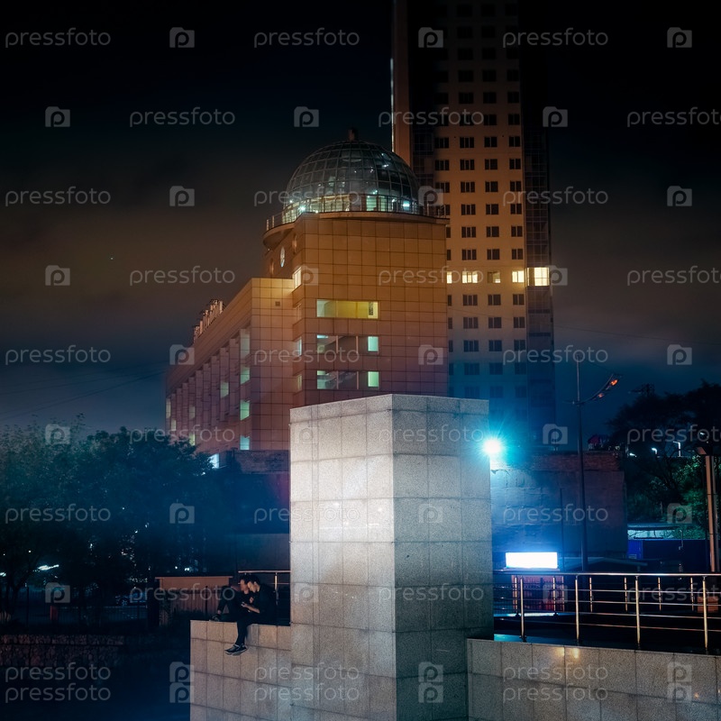 Ночной пейзаж с видом на современный отель, рекламные щиты и людей