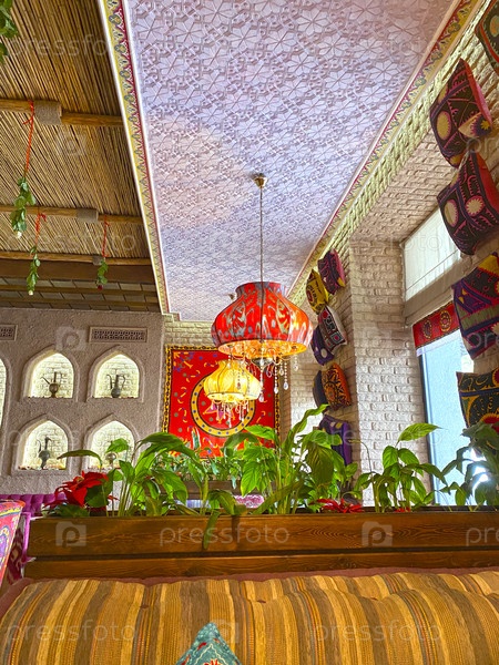 Симферополь, Крым - 5 июня 2021 г.: Интерьер кафе в восточноазиатском стиле