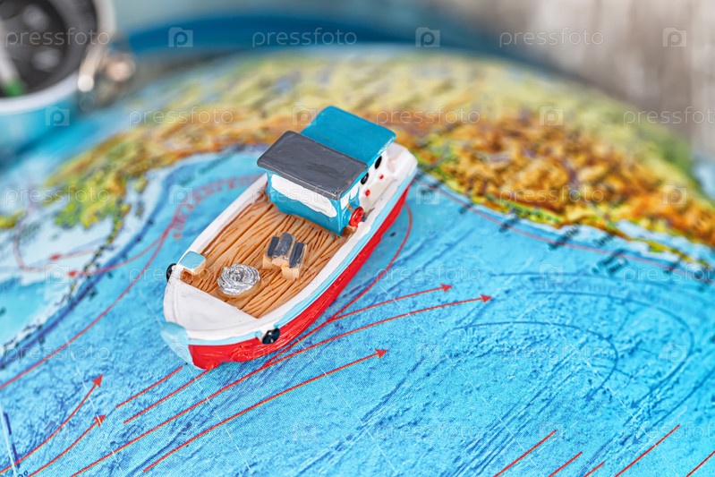 Маленькая игрушечная лодка стоит на глобусе в океанах