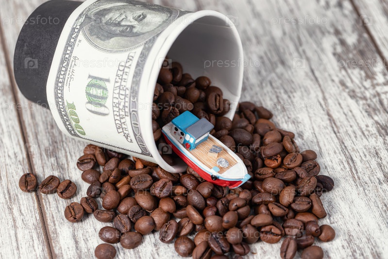 Маленький игрушечный кораблик плывет из бумажного стаканчика по волнам кофейных зерен