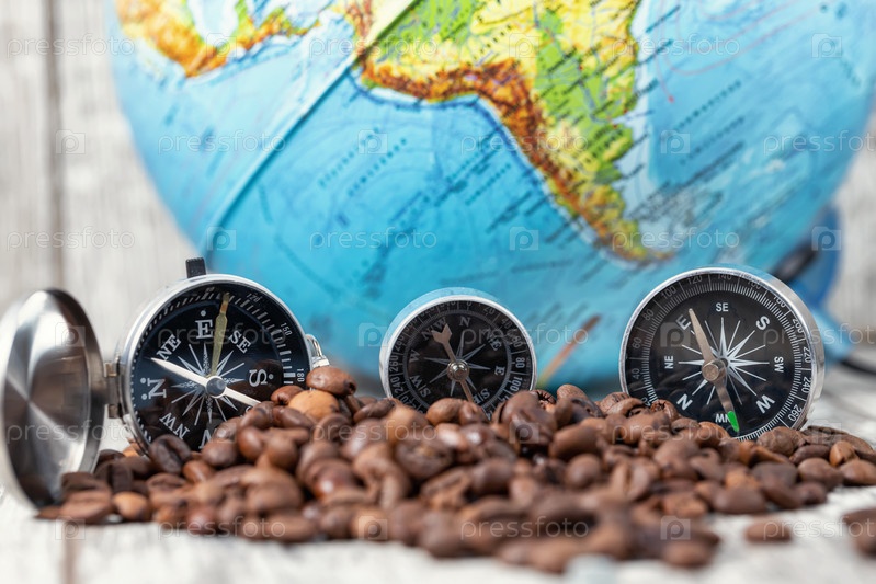 Компас лежит на кофейных зернах на фоне долларовой купюры