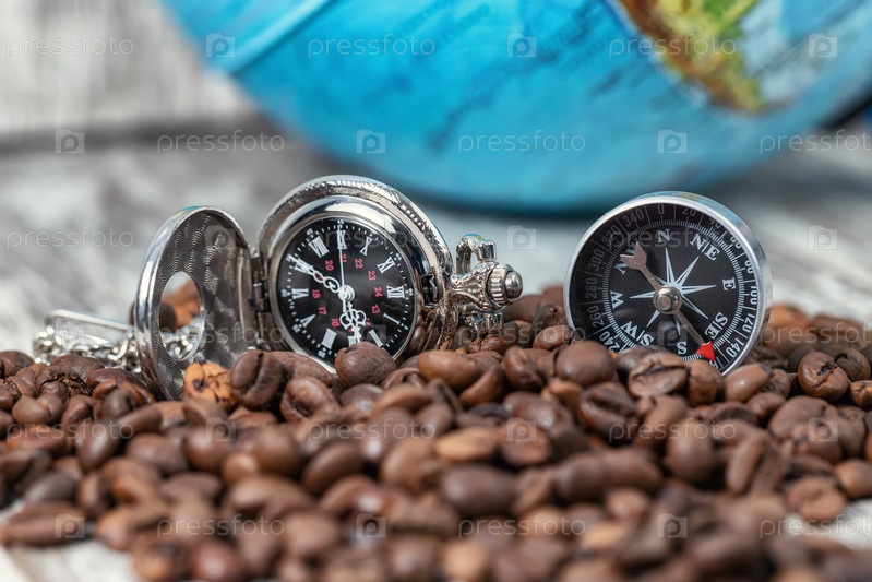 Компас лежит на кофейных зернах на фоне долларовой купюры
