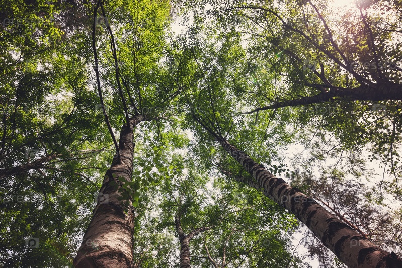 Вид снизу вверх на кроны высоких деревьев в диком лесу