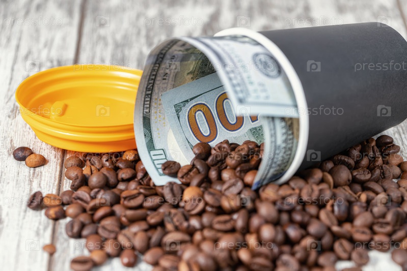Вставлен веер стодолларовых купюр и бумажный стаканчик. Кофейные зерна разбросаны вокруг. Вертикальная ориентация дисплея телефона