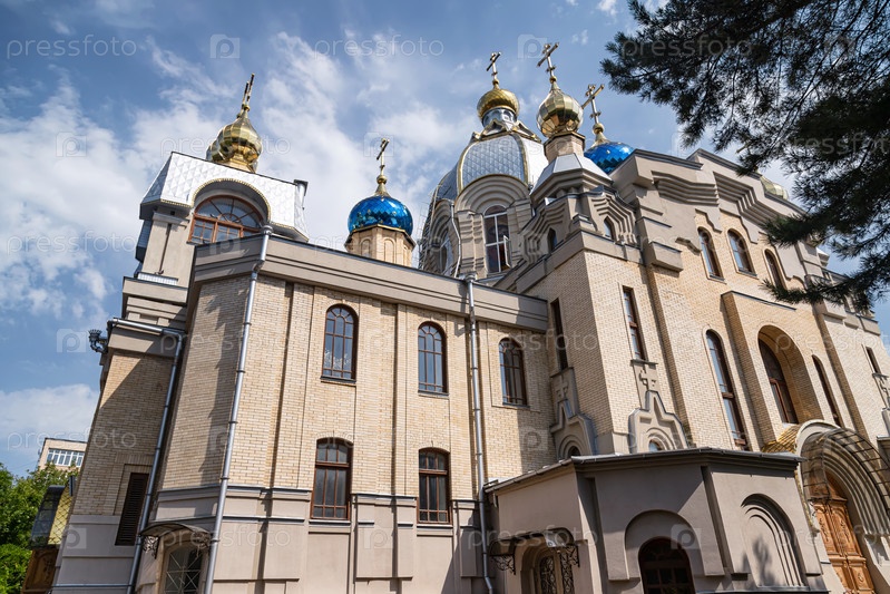Православная церковь целителя Пантелеймона. Кирпичный храм с несколькими куполами, украшенными крестами