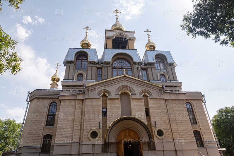 Православная церковь целителя Пантелеймона. Кирпичный храм с несколькими куполами, украшенными крестами
