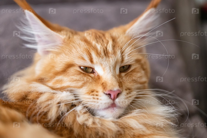 Большой рыжий пушистый кот мейн-кун лежит на ковре и лижет лапы
