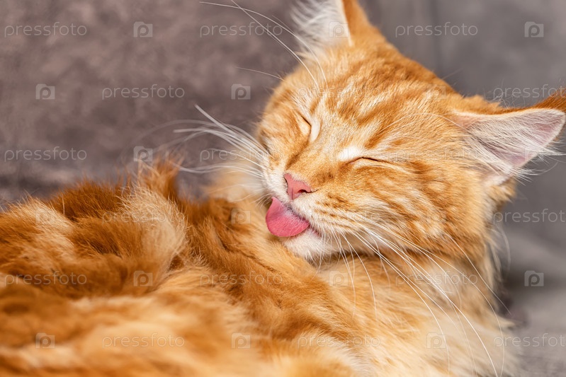 Большой рыжий пушистый кот мейн-кун лежит на ковре и лижет лапы