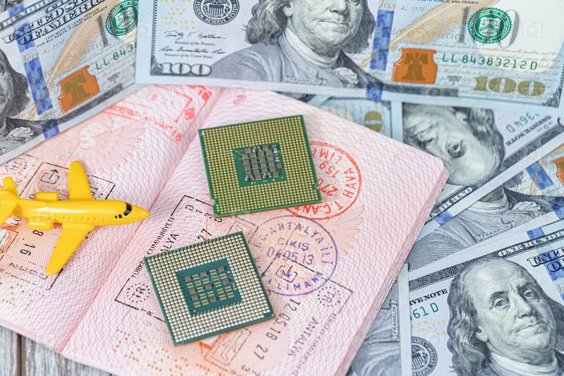 Паспорта, старые компьютерные чипы и игрушечный самолетик лежат на разбросанных долларовых купюрах