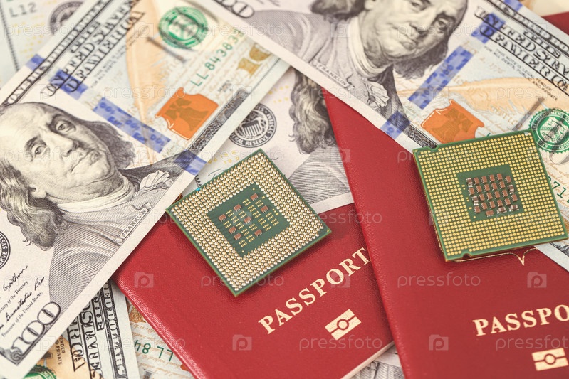 Два старых компьютерных процессора лежат поверх паспортов и долларовых банкнот