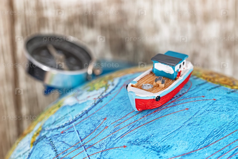 Маленькая игрушечная лодка стоит на глобусе в океанах