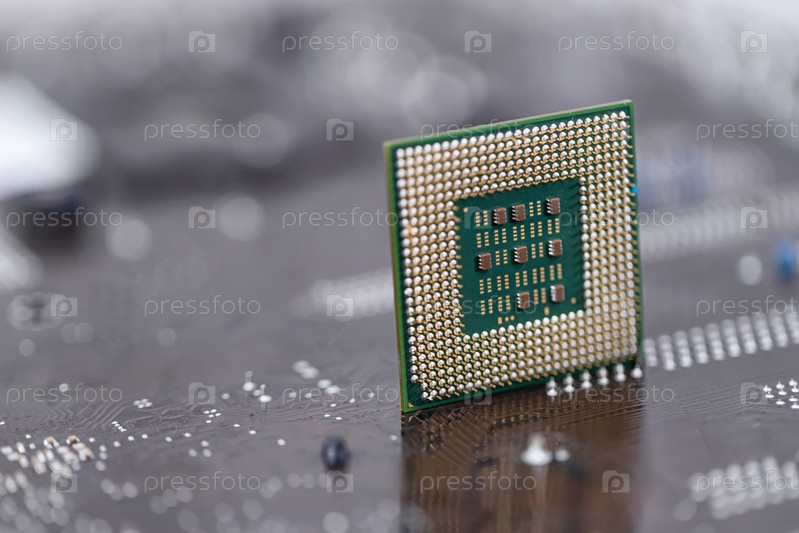 Старый компьютерный процессор стоит на фоне материнской платы