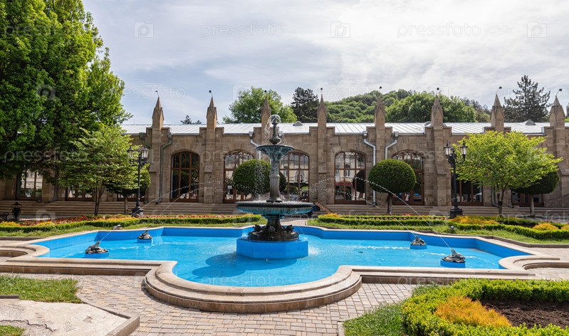 Красивый чистый фонтан и клумбы в парке санатория