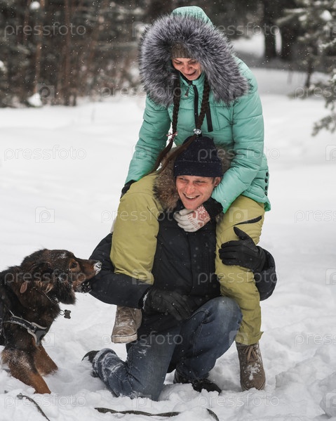 Милая пара развлекается со своей собакой в зимнем лесу