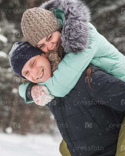 Счастливая молодая пара. Мужчина катает на спине свою девушку в зимнем лесу