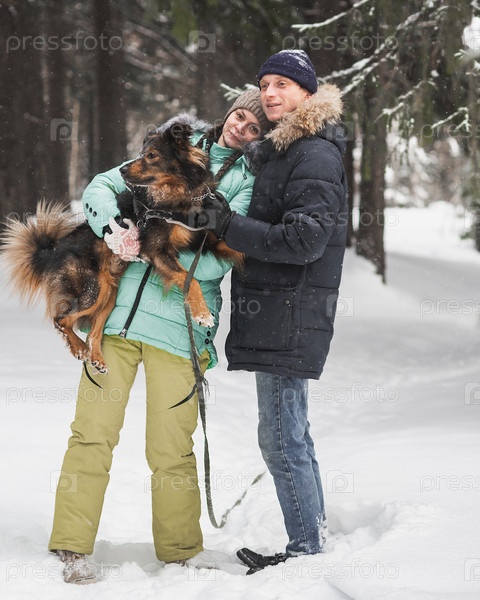 Милая пара гуляет и развлекается со своей собакой в зимнем лесу