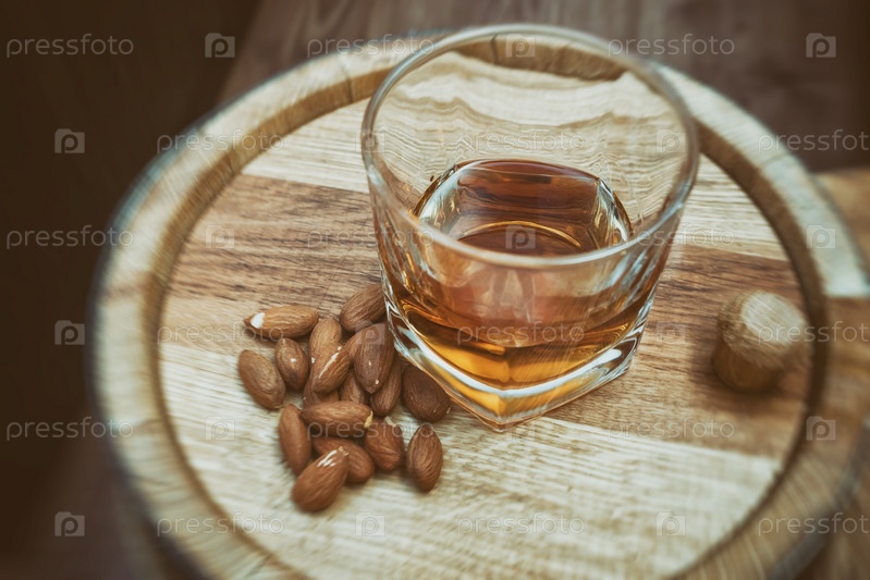 Небольшая деревянная дубовая бочка для домашнего производства и стопка выдержанного в ней виски